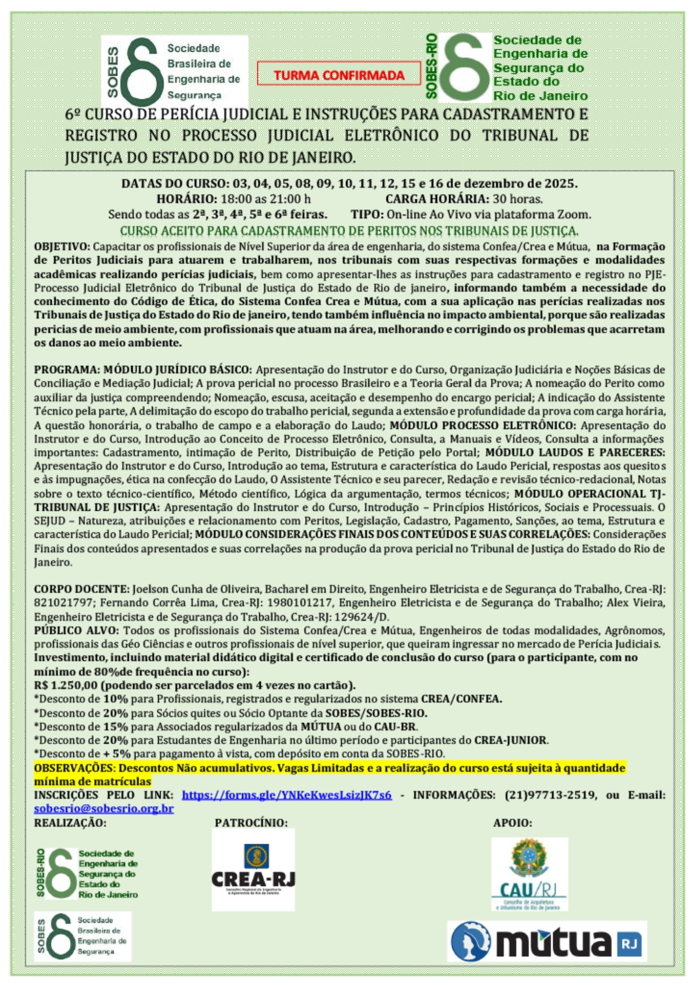 Concluo o 6º Curso de Perícia Judicial E Instruções Para Cadastramento E Registro No Processo Judicial Eletrônico Do Tribunal de Justiça Do Estado Do Rio De Janeiro, oferecido pela SOBES-Rio, com a sensação de ter feito uma escolha muito acertada neste momento da minha trajetória profissional.